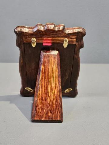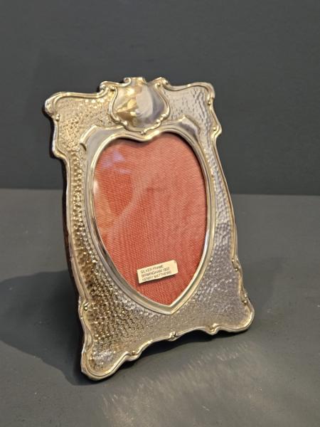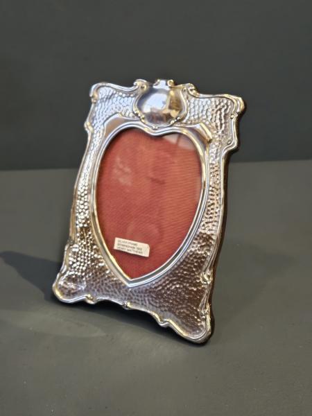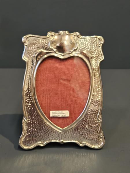 A top quality Edwardian Art Nouveau photo frame with planished finish, hallmarked Birmingham 1902. The solid silver front with swept flowing outer edges in the Art Nouveau style; planished finish to the inner border and heart shaped photograph window. The silver face set on a solid polished oak back with sturdy easel. Bears the makers mark for Birmingham silversmiths Henry Matthews along with clear hallmarks. Presented in immaculate condition with a deep shine. Takes photograph 4" x 5".  Measures overall 5.5" wide x 7.5" high. Stock number 41330.