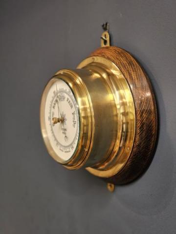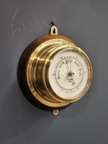 A top quality Victorian brass cased bulkhead ships barometer on the original oak plinth by Cooke of Hull, fully serviced and working c.1900. The polished brass case with mounting flanges to the rear and cast bezel to the front. The glazed view window with central reading marker, plus porcelain dial with weather predictions all sat over the aneroid movement. The barometer is on the original turned polished oak plinth with hanging mounts to the top and bottom. Bears the makers name Cooke, Hull, who are noted as specialist clock, barometer and chronometer makers. Presented in excellent condition, fully serviced and working. Measures 8.75" wide x 4" deep x 10" high with hanging loops. Stock number 40605.