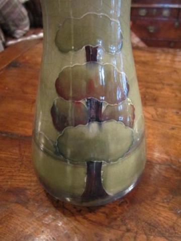 An Early Moorcroft Hazeldene pattern shaped vase.c.1915. Signed William Moorcroft to the base. Trees in landscape on a light green ground. Very sought after early pattern. Measures 5.5"diameter x 9.5"high. Stock no.27681.