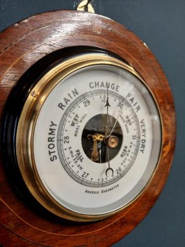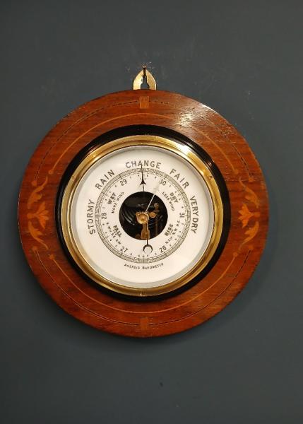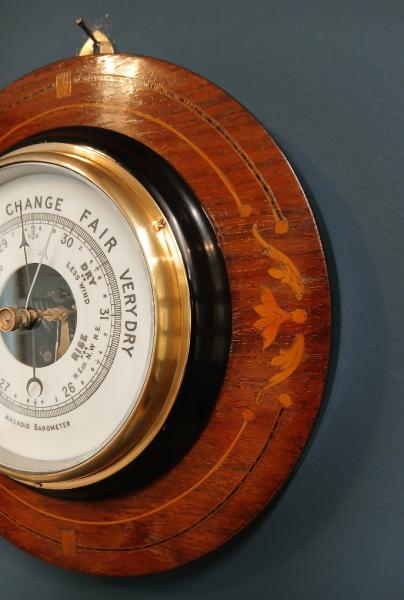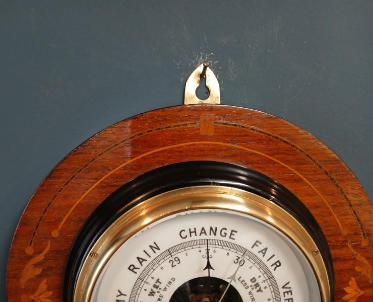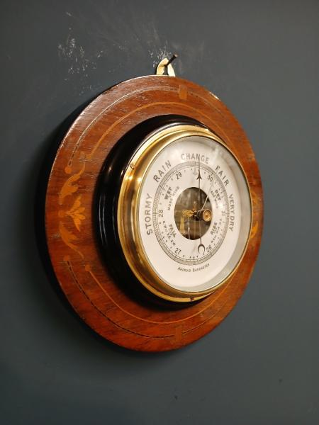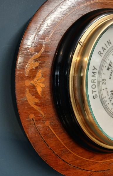 Antique Edwardian Rosewood and Fruitwood Inlaid Aneroid Barometer at Sturmans Antiques barometer for sale