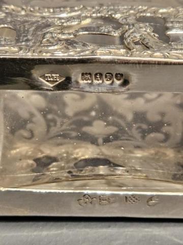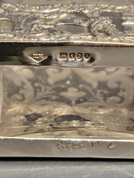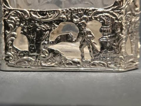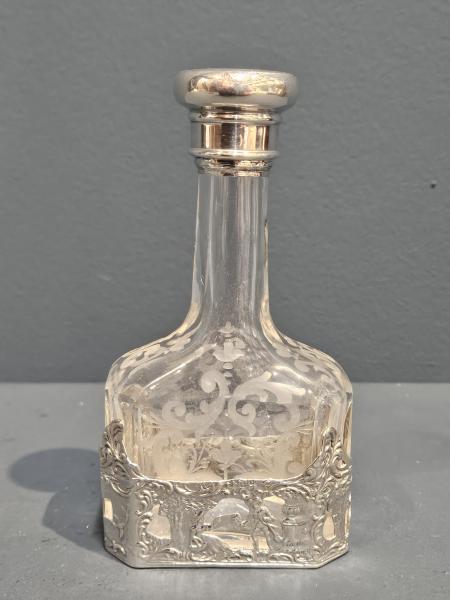 A small Edwardian cut and etched crystal liqueur decanter with decorative silver overlay to the base and silver screw top, hallmarked London 1904. The crystal vessel with oblong base, long neck and floral scroll design to the lower half. The base set in an embossed and fretted silver overlay depicting a farming scene. Engine turned finish to the silver screw top. The base with import marks plus the makers mark for German silversmiths Berthold Muller and a London hallmark for 1904 on the lid. Presented in immaculate condition with perfect crystal ware. Measures 2.75" wide x 1.5" deep at the base x 5" high. Stock number 42180.