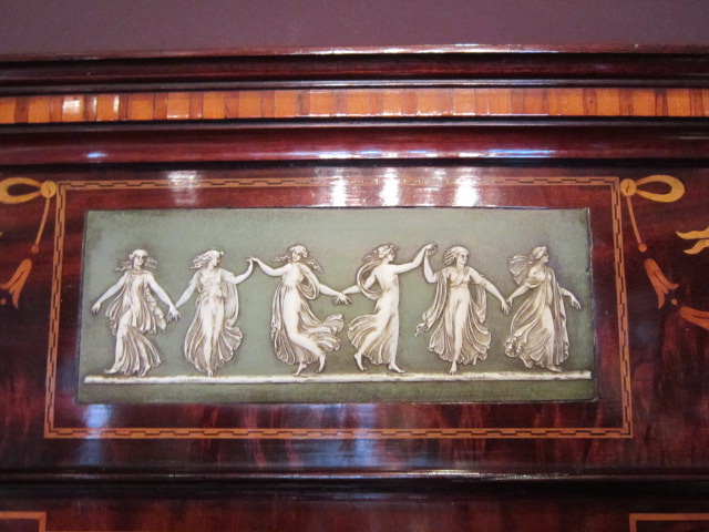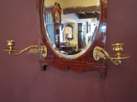 An Elegant Art Nouveau mahogany inlaid wall mirror.c.1890. Wedgewood porcelain panel to the top. Original oval bevelled edge mirror. Fruitwood inlay and satinwood banding. Brass sconce's to the base. Superb condition. Measures 14.5" x 27"long x 7.5"deep. Stock no.27578.