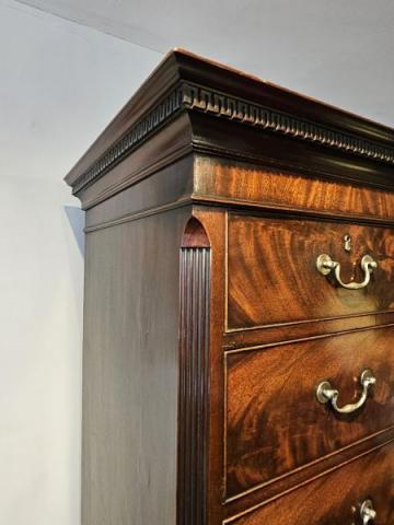 An outstanding quality George III period mahogany secretaire chest on chest in the manner of Gillow, with original brassware and superb original colour and patina c.1760. The upper section with moulded cornice to the top and dental moulding below. Two over three drawer formation; each drawer with figured timbers and cockbead edges. The top chest with quarter reeded canted corners. The base section with moulded edge to the top and three graduated drawers below to match the top chest; the top secretaire drawer pulling out and the front falling with release catches to form a writing surface. The back of the secretaire fitted with a selection of drawers and pigeon holes. Moulded base rail with original ogee bracket feet below and solid mahogany sides. Superbly made with oak drawer linings and choice solid timbers throughout. Presented in excellent original unrestored condition with original brass fittings and locks, superb colour and lovely original patina. Separates in to two sections for moving. Measures 45" wide at the cornice x 23" deep at the cornice x 76" high. Stock number 43220.