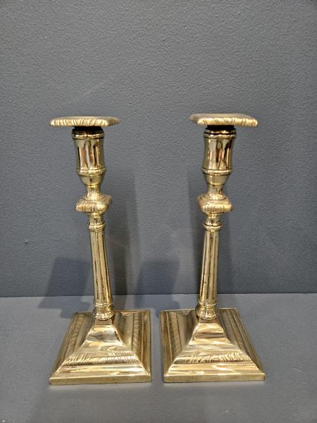 A matching pair of George III period solid brass candlesticks with removable sconces c.1810. Cast stepped bases with decorative engraving, tapering reeded columns above with knuckles below the candle holders. Removable square sconces to the tops with engraved edges to match the bases. Both presented in excellent condition with a deep shine. Each measures 3.25" square at the bases x 8.75" high. Stock number 42824.