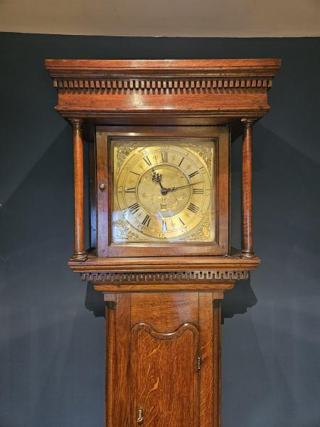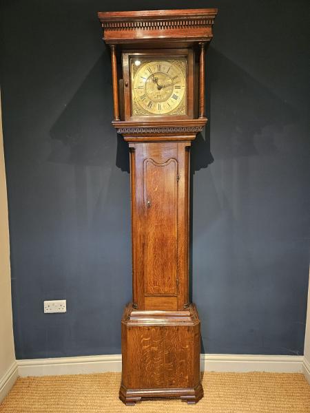 A quality George II slim figured oak cased brass dial longcase clock by Peter Haythornwaite of Kirkby Lonsdale, fully restored and working c.1750. The slim proportioned solid figured oak case with dental moulding below the hood cornice, red walnut pillars either side of the glazed hood door and complementing Greek key design moulding to the top of the trunk. The slim trunk with quarter columns either side of the long, slim, moulded edge door. Canted corners to the base, moulded plinth below with small ogee bracket feet to the base. Brass dial with matted centre and scroll design decorative engraving, which includes a date aperture and cartouche with the makers name; cast spandrels to the corners along with the original blued steel hands. The 30 hour movement with anchor escapement and bell striking on the hour, plus original weight and pendulum. Peter Haythornwaite, originally from Lancaster is recorded as working in Kirkby Lonsdale from around 1711 until his death in 1760 and wound and repaired St Mary's church clock in the town.  He and his wife are buried in the church yard and his son Peter II followed him into the trade. This fine example with a superior quality case typical of his clocks is presented in superb original condition, fully serviced and working. A short video of this clock chiming can be viewed on our YouTube channel - click here.  Measures 23" maximum width with a 12" trunk width x 12" maximum depth at the hood cornice and a 6" trunk depth x 85" high. Stock number 40201.
