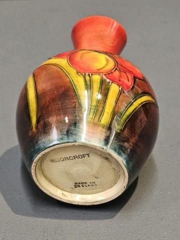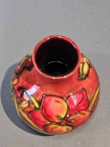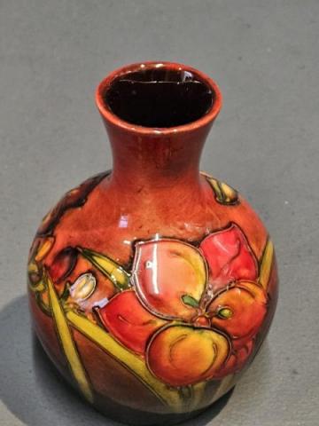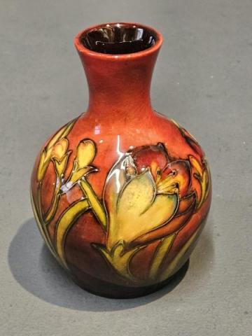 An immaculate Moorcroft freesia pattern flambe glazed bottle vase c.1940's. The vase with bulbous base and narrow flared neck; the base of the vase decorated with a continuous band of tube lined freesias in bud and fully opened, which are set against foliage. The flowers painted in rich reds, yellows and purples with green leaves, overglazed with a rich terracotta red flambe glaze. Moorcroft factory impressions to the base and presented in immaculate perfect condition. Measures 3.5" maximum diameter x 5" high. Stock number CB1340.