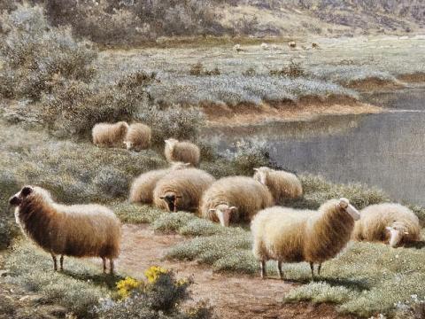 A fine original oil on canvas entitled 'Near Beddgelert, North Wales' by Cheshire born artist Walter J Watson (1879-1979). Superbly painted with a calmness typical of the artist and in a soft colour palette. Set on a summers day with sheep grazing in the foreground by softly flowing waters, trees in full leaf and mountains to the background. Signed by the artist and dated 1913. Walter Watson exhibited at the Royal Cambrian Society in 1910 and 1937 and at Walker art gallery in Liverpool. This example presented in superb condition and sat in the original timber gilt frame. Measures 31.5" wide x 15.5" high including frame. Stock number CS341.