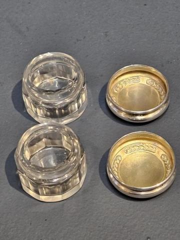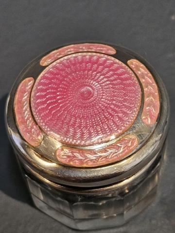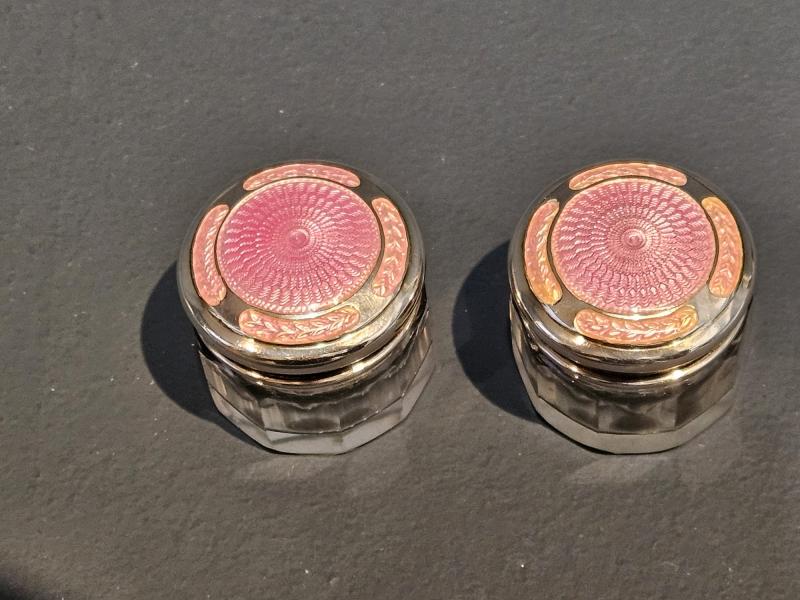 A matching pair of George V period solid silver engine turned pink enamel topped dressing table jars with faceted crystal bases, hallmarked Birmingham 1926. The slightly domed silver lids with engine turned decoration and floral boarders finished in a deep pink enamel. Each jars lid fitting snugly to the original and perfect faceted crystal bases. Each bears the makers mark for Birmingham silversmiths Turner & Simpson along with clear hallmarks. Both presented in immaculate condition. Each measures 1.25" diameter x 1" high. Stock number 40771.