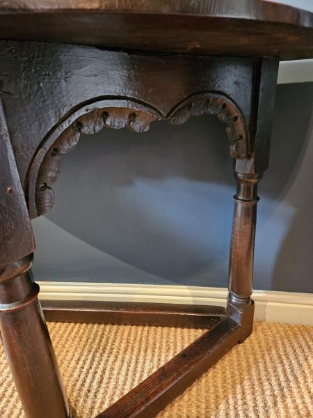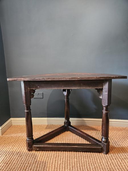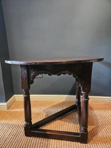 An unusual period oak side or serving table with turned baluster shaped legs and superb carved arched apron c.1690. Planked half round top sat over a triangular base. Carved arched top rails with scalloped edge forming a deep apron. Baluster shaped legs supporting base strechers, with the owners initials stamped to the top of one leg. Pegged top and joints, superb colour and rich patination throughout; origins probably South Wales. Measures 42" maximum width x 20.5" deep x 31" high. Stock number CS403.