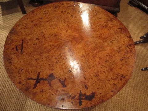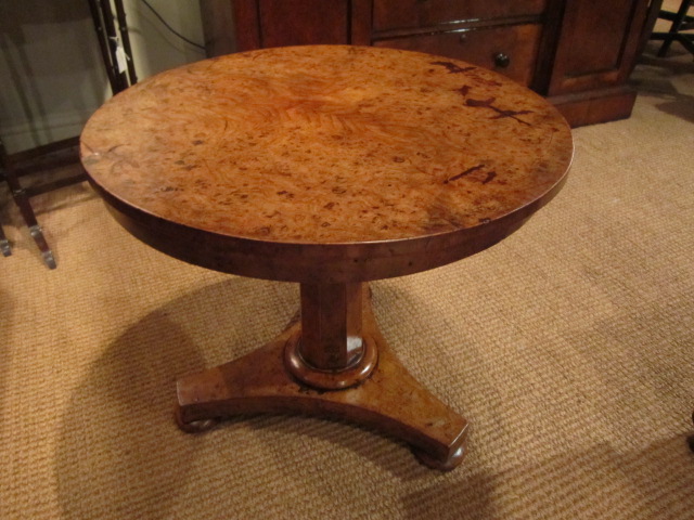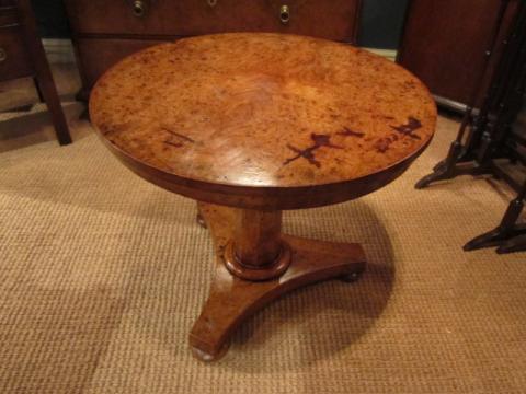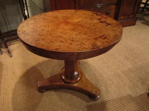 A Quality William IV pollard oak circular occasional table.c.1835. Hexagonal support to a tripod base and bun feet. Burr veneers to the drum top. Suitable as a coffee table. Measures 23"diameter x 20"high.