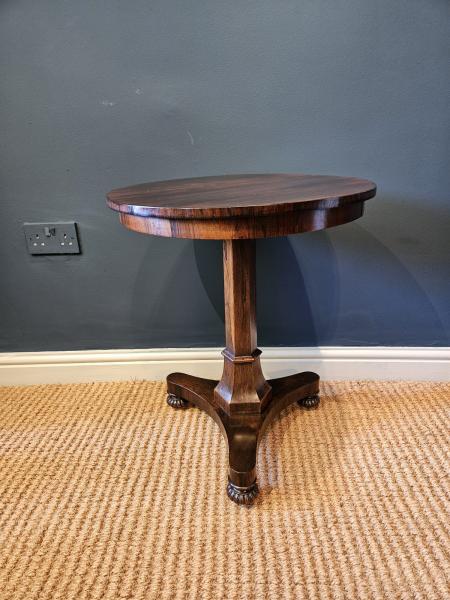 A fine quality Regency low proportioned occasional or lamp table with decorative foot c.1830. Circular figured rosewood veneered top with shallow apron below, sat on an octagonal column with flared mount to the base. The base with a three way foot, each with carved bun feet and concealed brass castors below. Ideal as a lamp table or by the side of a chair. Presented in superb original unaltered condition with with a rich polish. Measures 20.5" diameter x 24.5" high. Stock number 43294.