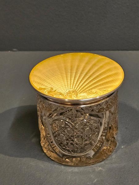A George V period silver and engine turned yellow enamel topped dressing table jar with original cut crystal base, hallmarked Birmingham 1929. The silver slightly domed push fit lid with engine turned sunburst design decoration and pale yellow enamel finish. Original matching cut crystal base with star cut underside. Bears the makers mark for Birmingham silversmiths C.S. Green & Co along with clear hallmarks. Presented in immaculate perfect condition. Measures 3.5" diameter x 3.25" high. Stock number 42748.