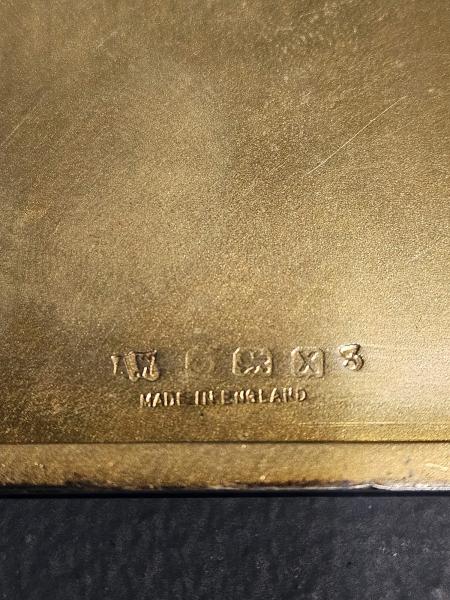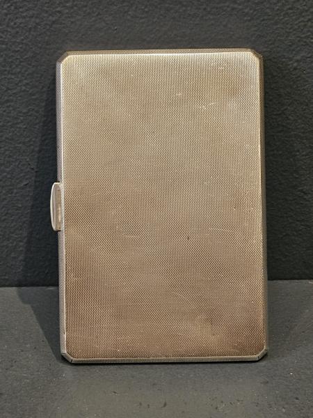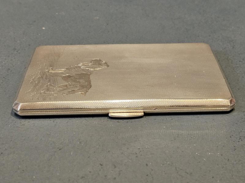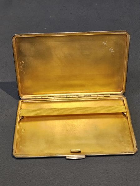 A solid cast silver cheroot case with Spaniel engraving and engine turned finish, hallmarked Birmingham 1922. Oblong form with clipped corners, the front with engine turned finish and Spaniel engraving to the front and complementing engine turned finish to the rear. Press release catch to the front; the case opening to reveal an immaculate unused gilt lined interior with retaining straps to each side to hold cheroots in position. Bears the makers mark for Birmingham silversmiths A Wilcox along with clear hallmarks to all sections. Weighing 6.6 troy oz, top quality and in immaculate condition. Measures 3.25" wide x 0.5" deep x 5" high. Stock number 43230.