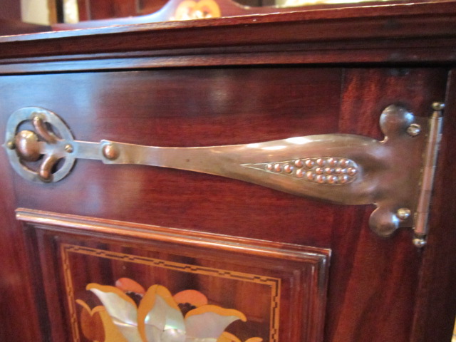 A Stunning Art Nouveau period mahogany inlaid music cabinet made by highly regarded cabinet maker, Shapland & Petter.c.1900. Fruitwood, satinwood and mother of pearl inlays to the double opening doors. Tudoric copper hinges and carry handles to the sides in the manner if Liberty's. Dividers to the interior for sheet music and the original ivory name panels to the sides. Inlaid gallery edge to the top. Tulip shaped frets to the under tier. Superb condition, colour and patina. Measures 22" x 14" x 48"high.