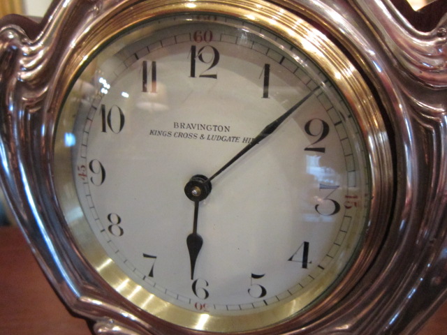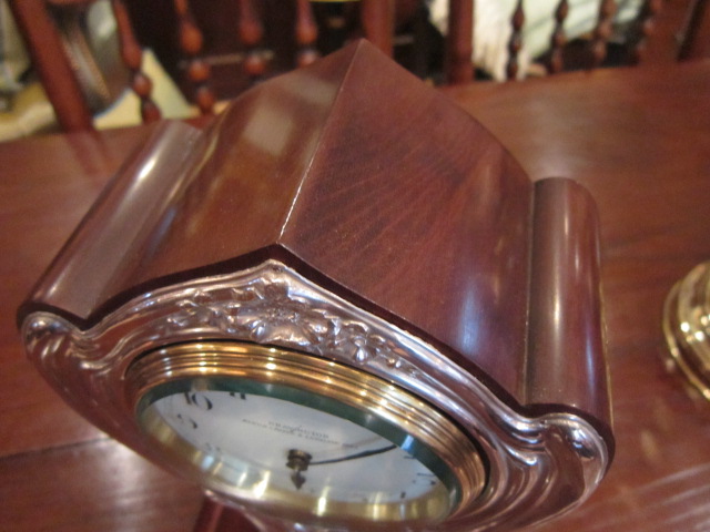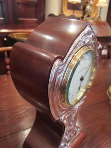 A Stunning Art Nouveau period mahogany and silver fronted mantel clock. 8 Day French movement, fully overhauled. Porcelain dial and convex glass bezel front. Made by Bravington's of Kings Cross & Ludgate Hill, London. Decorative silver front, hallmarked Birmingham 1909. Polished mahogany case standing on brass bun feet. Superb quality and condition. Measures 6.5"wide x 3.5"deep x 12"high.