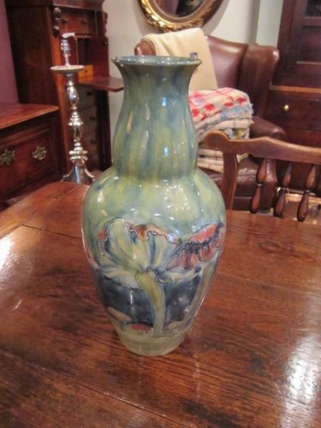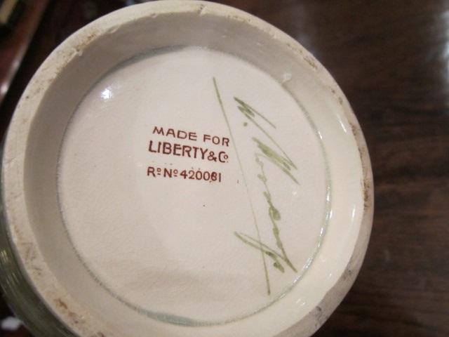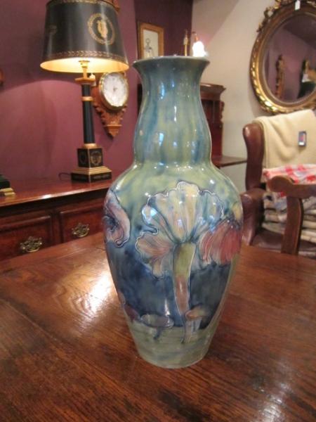 A Stunning Moorcroft Liberty's Claremont large vase. Signed William Moorcroft to the base and stamped Liberty's. Registered no.420081.c.1912. Five large toadstools and ten small toadstools. On a green ground with blue background. Yellow hints to the finish, no runs. Excellent condition. Measures 6"diameter x 13.25"high. Stock no.26474.