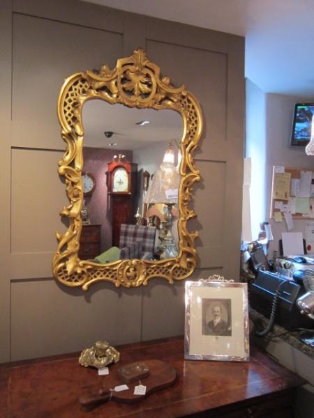 A Superb Early Victorian timber gilt Rococo style wall mirror.c.1840. Original mirror glass. Scalloped shaped sides with foliage decoration. Fretwork to the top and base. Measures 26" x 40" x 2"deep.