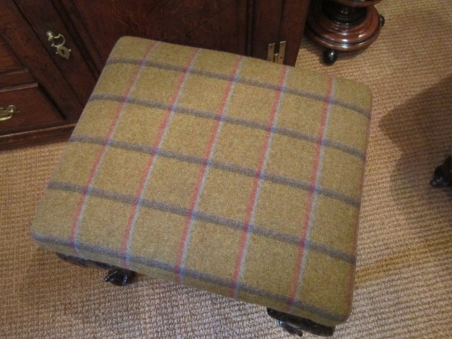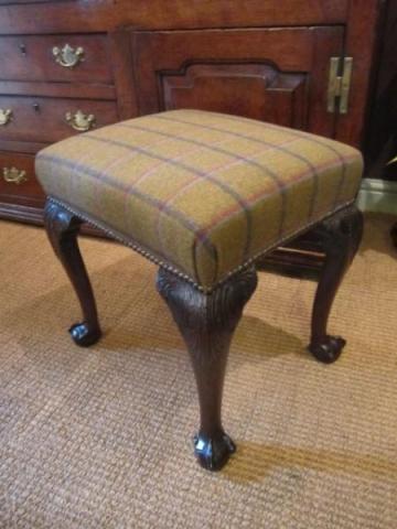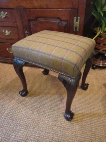 A Superb George III period cabriole leg stool.c.1800. Over stuffed horsehair seat recovered in Abraham Moon pure wool. Carved top cabriole legs to ball and claw feet. Superb rich colour and firm frame. Measures 19" x 15" x 19"high. Stock no.27556