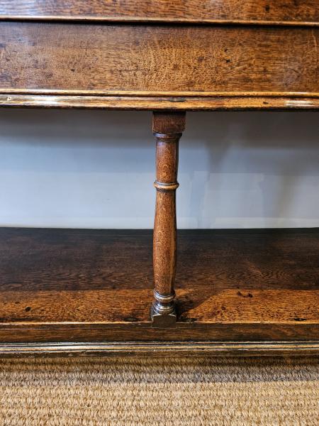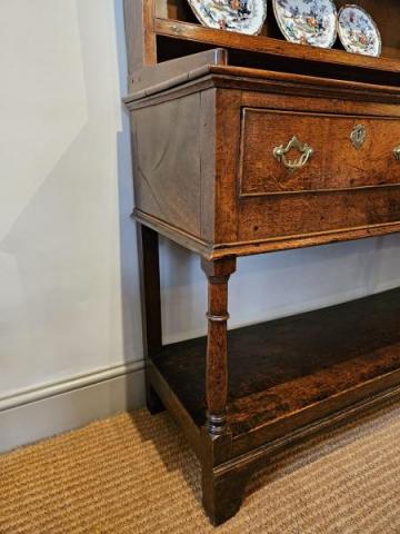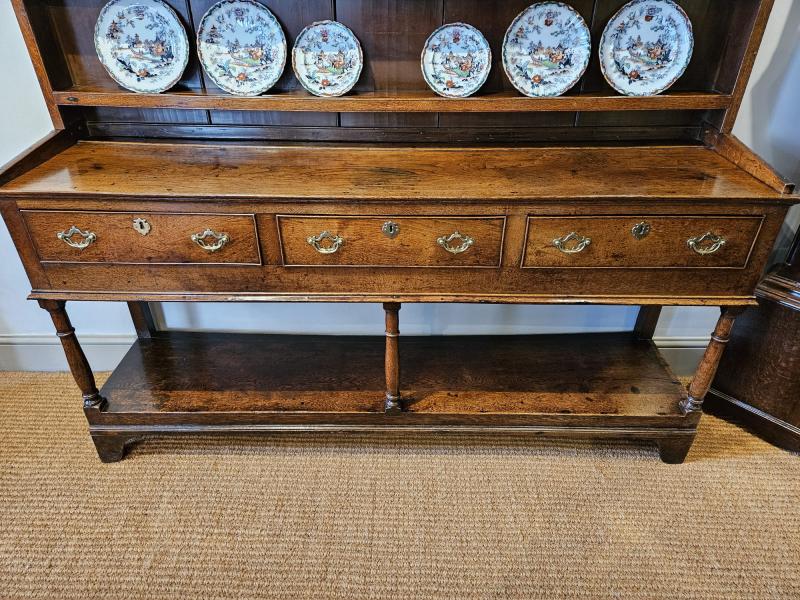 A superb quality George III period oak country house open pot board dresser with matching rack in outstanding original condition c.1760. Single plank figured oak surface to the base with three drawers below each with cock beaded edges and original superior quality brass handles. Plain apron below with moulded lower edge supported by three elegant turned columns. Single piece pot board to the base with moulded foot below and original bracket feet. The original plate rack sat to the rear of the surface with supporting shoes; moulded frame to the front edge of the plate rack edges with forged iron cup hooks. Moulded cornice to the top and original boarded back. North Lancashire/ South Lakeland origins and presented in outstanding original condition with a superb mellow colour and rich patina. Crockery shown in images sold separately. Measures maximum 75" wide x 17" deep x 83" high to top of rack or 34" high to surface of the base. Stock number 43067.