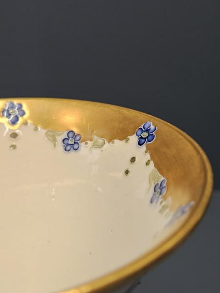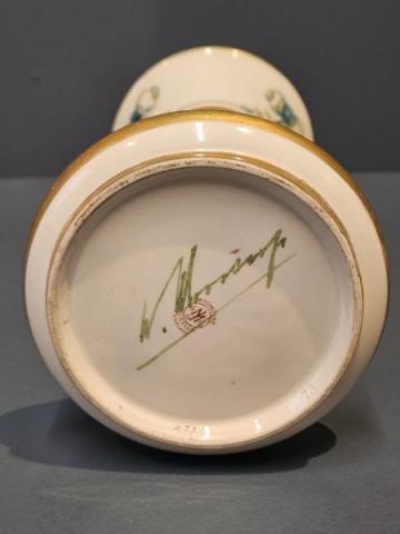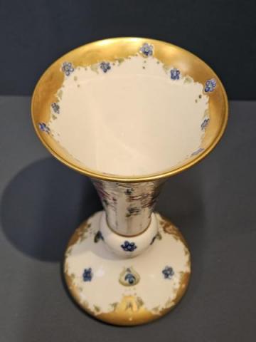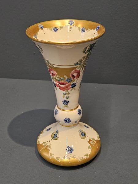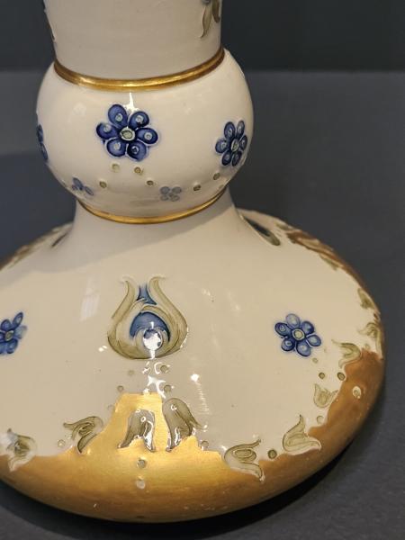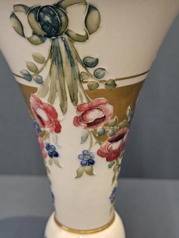 A superb McIntyre Moorcroft 18th Century pattern trumpet vase with bulbous base c.1908. Wide and shallow bulbous base with knuckle above, which joins the tall trumpet shaped top. Superb tube lined decoration with swags of roses and forget-me-nots to the upper half in pinks, blues and soft greens sat on an ivory ground. Complementing decoration to the base and to the interior of the rim. Panels of gilt infill to the rim central knuckle and base in outstanding unworn condition. Bears the McIntyre factory mark to the base along with William Moorcrofts signature in green. Presented in perfect mint condition.  Measures 4.25" diameter at the rim x 8.25" high. Stock number 42887.