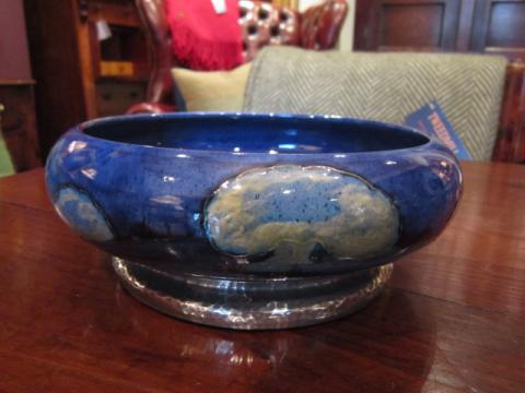 A Superb Moorcroft 'Moonlit Blue' pattern rimmed bowl on a pewter 'Tudoric' base. Made for Liberty's. Decorated to the inside with three trees in landscape. Eight trees decorated to the surround. Stamped Moorcroft to the base. Measures 8.5"diameter x 3.25"high. Stock no.26752.