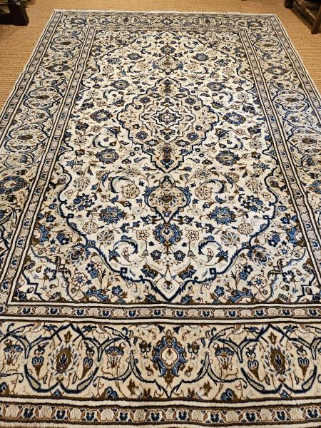 A superb quality Persian Kashan rug with rich champagne background and blue copper floral decoration c.1920. Premium quality and hand knotted with a deep dense pile typical of a Kashan rug. The background of the rug in a rich champagne cream, medallion to the centre framed in a matching light cream ground.  Broad border to the outer edge. The floral decoration and broad outer boarder decoration in tones of navy, teal blue copper brown and deep cream. Presented in excellent unworn stain free condition, newly cleaned ready for use. Measures 9' 7" long x 6' 6" wide. Stock number 42915. TO PURCHASE THIS RUG PLEASE CONTACT THE SHOP VIA THE PHONE NUMBERS PROVIDED ON THIS WEBSITE.