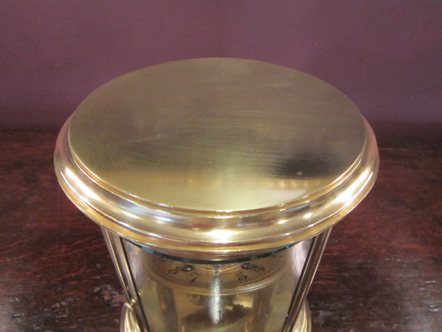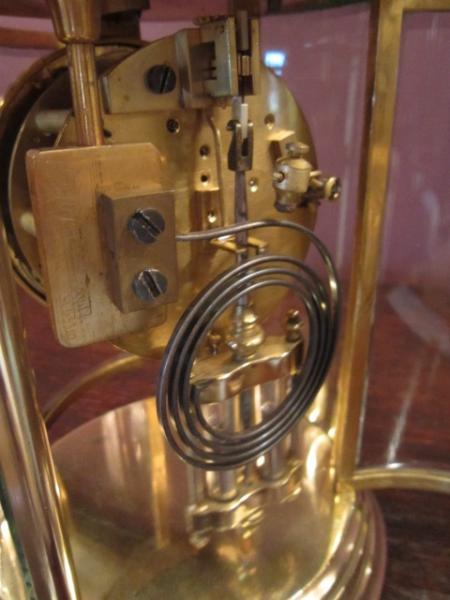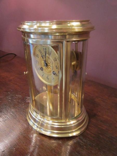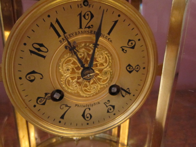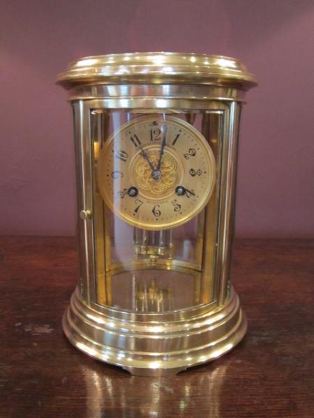 A Superb Late Victorian oval 'Four Glass' mantel clock.c.1895. Gilded dial to the French 8 Day movement. Striking on the hour and half. Complete with the original pendulum. Bowed bevelled edge glasses to the polished brass case. Retailed by Bailey, Banks and Biddle of Philadelphia (working 1832-) . Top condition. Full working order. Measures 6.5" x 5.5" x 9"high.