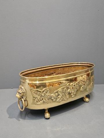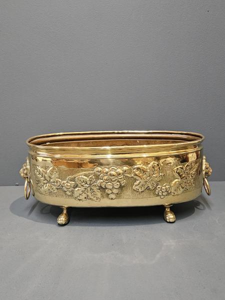A superior quality Victorian solid embossed brass planter with cast fittings c.1880.  Elongated oval form with with rolled rim to the top and the sides embossed with a decorative grape and vine design border. Cast brass lion mask handles to the sides with ring drops and four complementing ball and claw feet to the base. Heavy quality and presented in immaculate condition with a deep shine. Holds 3 x 5" diameter plant pots and is water tight. Measures 17" long x 6.5" deep x 6.5" high. Stock number 43076.