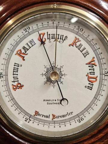 A Victorian figured mahogany cased aneroid barometer by Arnold of Southsea c.1880. The deep turned figured mahogany case with fitting for wall hanging to the rear. Aneroid movement sat behind a white porcelain dial with weather predictions in red and black ornate lettering and bears the retailers name Arnold & Sons, Southsea. The dial sat behind a glazed viewing window mounted in a polished brass bezel with centre reading marker. Superb quality and original condition, fully serviced and working. Measures 9" diameter overall x 2.5" deep. Stock number 42858.