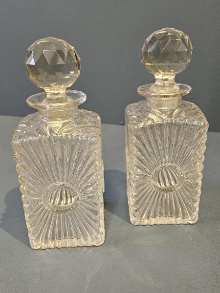A Victorian golden oak two bottle tantalus with original crystal decanters and silver plated decorative fittings in mint condition c.1890. The solid golden figured English oak frame with shaped sides and two compartment tray to the base to hold the decanters in place. Moulded oak locking bar to the top with silver plated carrying handle, lock set to the side with key release. Silver plated bound corners to the base. The original crystal decanters with matching stoppers in mint condition, working lock with original key. The casework with a rich colour and original patina, presented in superb original condition. Measures 10" wide x 5" deep x 11.5" high. Stock number 43165.