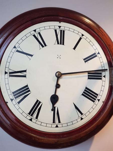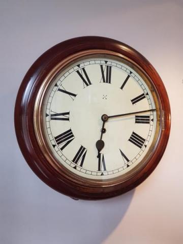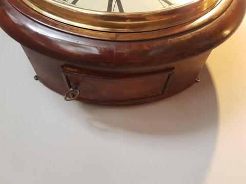 An Edwardian mahogany cased 8 day 12" dial `English dial` clock C.1900/10. Original painted dial bearing the manufacturers mark of crossed arrows `Hamburg - American Clock Company` Brass bezel to the glazed hinged door. Access door to the base. Original movement, fully serviced. Measures 16" diameter. x 6" deep. SN 32631