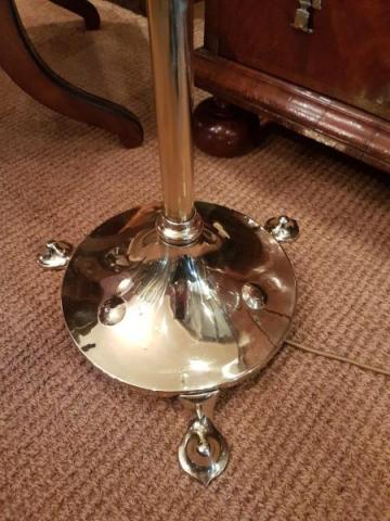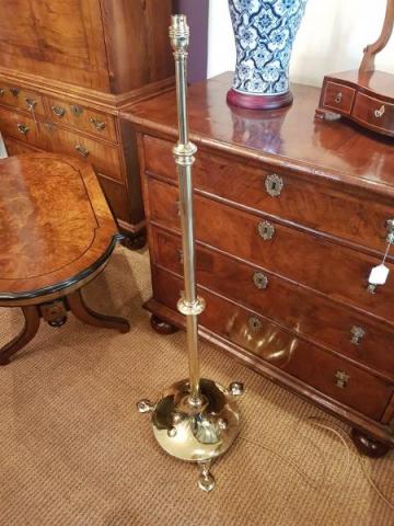 An Original Art Nouveau antique solid brass rise and fall lamp standard. c.1905. Heavy base with stylized cast brass feet, with matching embossed decoration to the foot. Tubular column with cast fittings. Rises and falls from the centre by 12" in height. Heavy base forming a sturdy lamp. Polished, lacquered and rewired ready for use. Measures 13" diameter base. x height rises from minimum of 48" tall to maximum of 60". Stock number 32795.
