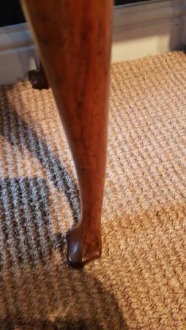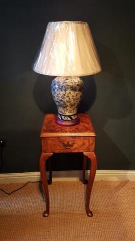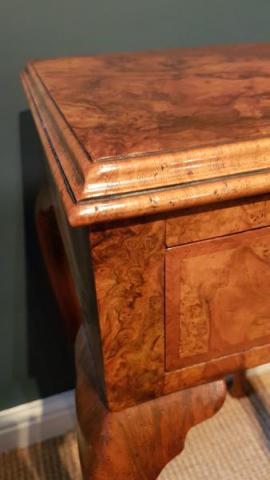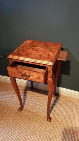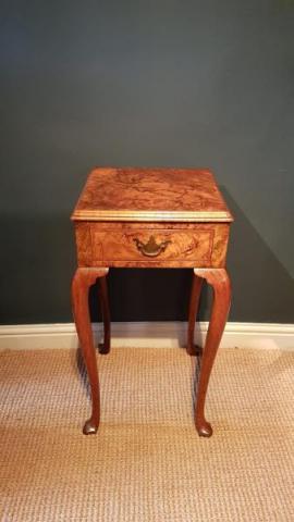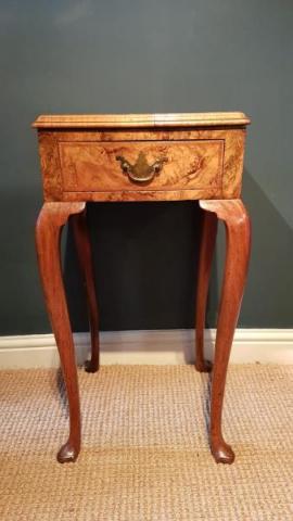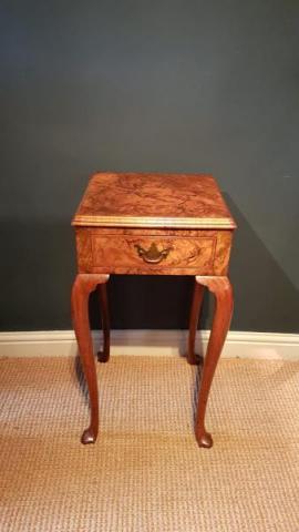 An Antique walnut lamp table in Queen Anne style C.1910. Mould edge to the burr veneered top, single drawer to the front with crossbanded edge and drop brass fitting, pull out brushing slide to the side. Sat on elegant cabriole legs with carved foot. Excellent condition with a deep shine, very sturdy and useable. Measures 16" wide x 16" deep x 30" high. Stock number 35569.