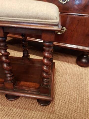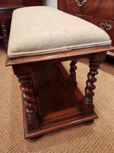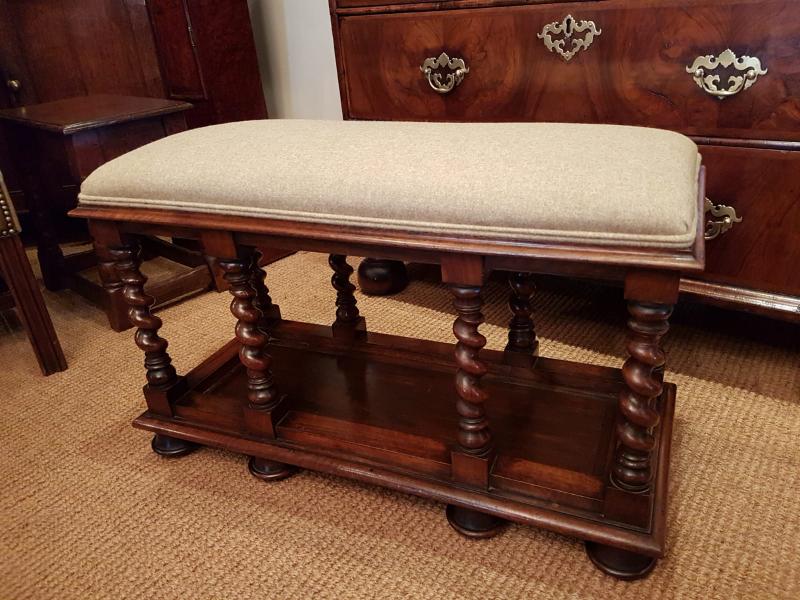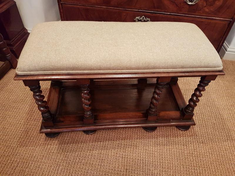 An unusual high quality William and Mary style walnut hall bench with upholstered lifting seat. C.1900. Eight barley twist legs to the moulded edge base sat on turned feet with concealed castors. Upholstered seat recovered in Abraham Moon pure wool fabric, that lifts allowing the interior to be used as a stick stand or luggage stand. Superb condition. Measures 36" long x 15" deep x 19" high.