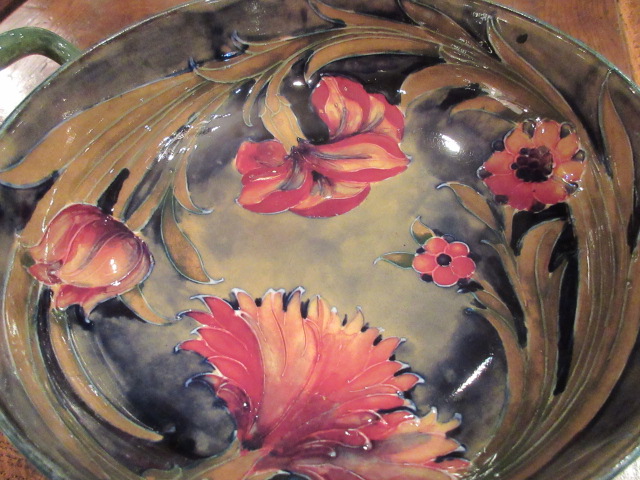 An Early Moorcroft Spanish pattern twin handled pedestal bow.c.1914. Signed William Moorcroft and stamped Burslem to the base. Beautiful colours on an ochre ground. Measures 11"wide x 7.5"diameter x 6"high.