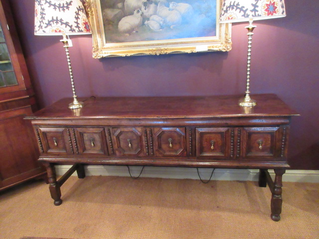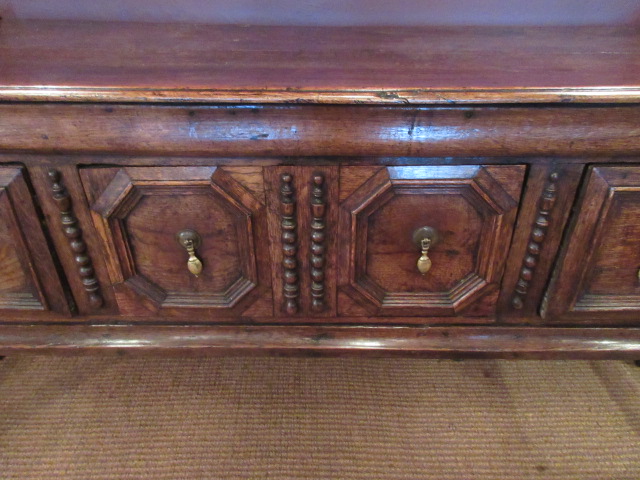 An Early Period oak three drawer dresser .c.1700. Geometrical panel fronts and beaded trim centres. Original brass drop fittings. Standing on turned supports to cross stretcher base sides. Planked top and fielded panel sides. Pegged joints throughout. Superb original colour and patina. measures 74" x 20" x 32.5"high.