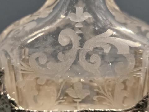 A small Edwardian cut and etched crystal liqueur decanter with decorative silver overlay to the base and silver screw top, hallmarked London 1904. The crystal vessel with oblong base, long neck and floral scroll design to the lower half. The base set in an embossed and fretted silver overlay depicting a farming scene. Engine turned finish to the silver screw top. The base with import marks plus the makers mark for German silversmiths Berthold Muller and a London hallmark for 1904 on the lid. Presented in immaculate condition with perfect crystal ware. Measures 2.75" wide x 1.5" deep at the base x 5" high. Stock number 42180.