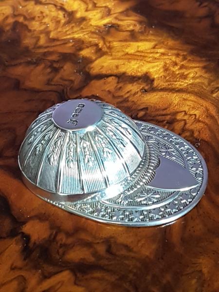 A very collectable Edwardian silver novelty jockeys cap caddy spoon. Finely embossed and engraved design to the cap and brim with shield for the owners initials. Bears the hallmark for Sheffield 1915. Thomas Bradbury and Sons Mint condition. Measures 2" deep x 1.5" wide x 0.75" high.