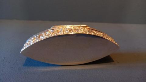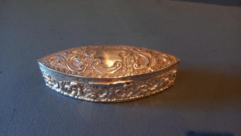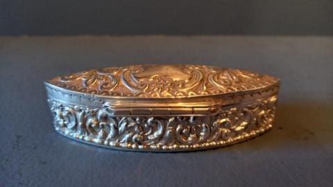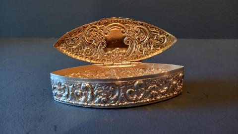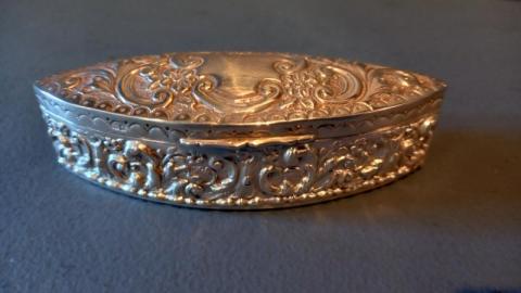 A fine quality Edwardian period solid silver lozenge shaped table box, hallmarked Birmingham 1903. Embossed decoration to the hinged top with blank cartouche and scroll decoration. The bowed sides with foliage decoration. Original gilded interior and presented in immaculate condition. Measures 4" wide x 1.75" deep x 1.5" high.  Stock number 36518.