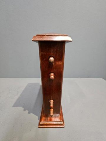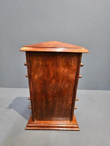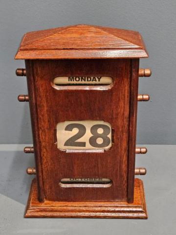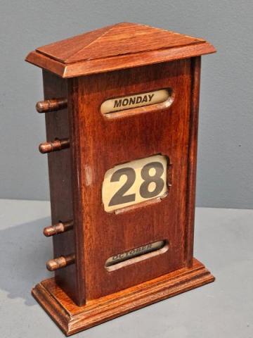 An Edwardian solid walnut perpetual desk calendar with original printed linen numerals in full working order c.1910.  Polished solid dark walnut case with chamfered top, moulded edges to the sides and a chamfered plinth to the base forming the foot.  Three glazed view windows to the front displaying day, date and month, each adjusted by turned knobs to the sides. The original printed linen spools in excellent clear condition. Presented in original condition with a rich polish. Measures 7" wide x 3.25" deep x 11" high. Stock number 42238.