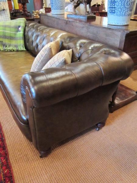 A Fabulous Late Victorian three seater chesterfield settee.c.1880. Deep buttoned back and shaped arms. Original horsehair upholstery to the overstuffed seat. Reupholstered in brown leather hide. Sat on turned mahogany feet. Measures 85" x 26.5" x 30"high. Seat 15.5"high. Lovely look and feel.
