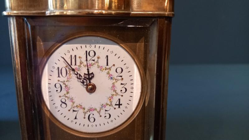 A Fine Antique 19th century brass serpentine cased carriage clock.c.1885. Circular porcelain fleur de lyse decorated dial with gilt masked surround. Polished brass serpentine shaped case with scroll carry handle to the top. Bevelled edge glasses to the surround in perfect condition. 8 Day French movement in full working order. Complete in the original case with key inset to the inside. Clock measures 3.25" x 2.75"deep x 4.5"high(including handle), case measures 4" x 3.5"deep x 5.25"high. Stock no.CB1236.
