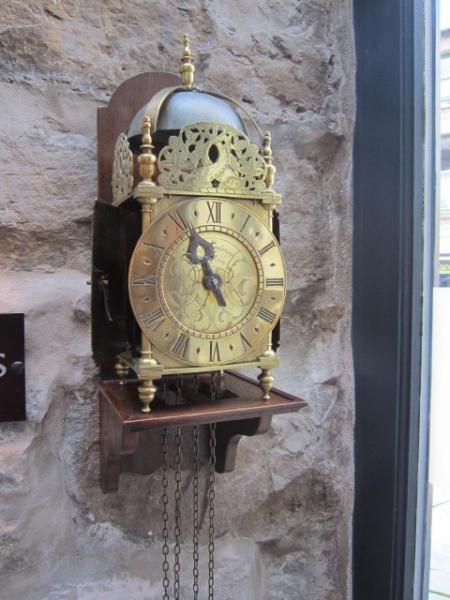 A Fine Early 18th Century brass cased Lantern clock made by Richard Sanderson of Wigton* (w.1704-29). 6" dial with engraved centre and single pointer. Verge escapement to the bell striking movement. Sat on a polished oak wall bracket. Clock measures 6" square x 15" , bracket measures 8" square x 21"long. Full working order.