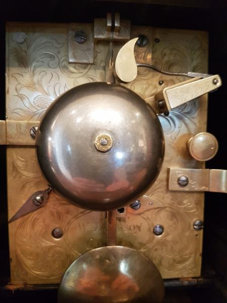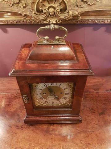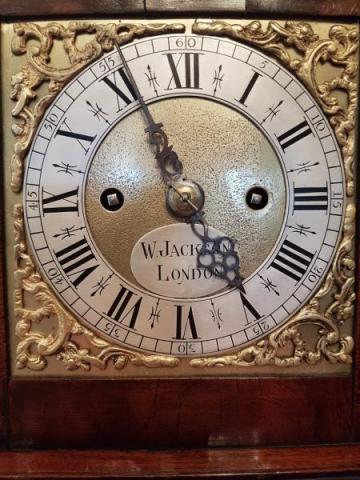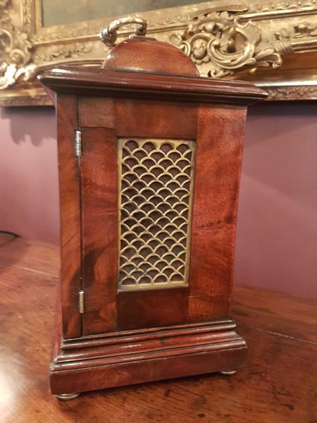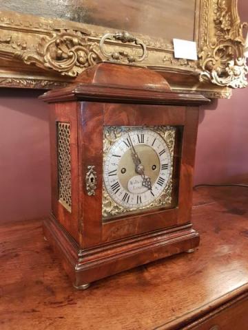 A Fine small proportioned George II period double fusee bracket clock by William Jackson of London c.1750. Figured mahogany timbers throughout the small proportioned bell top case with original brass carry handle to the top, matching brass lock escutcheon and pad feet. Engraved brass and silvered dial with matted centre and cast brass spandrels, engraved with the makers name. Original fretted blued steel hands. Decorative engraved back plate also bearing the makers mark. Anchor escapement to the double fusee movement striking on a bell on the hour. Fully overhauled movement. William Jackson of London is recorded as working between 1725 and 1776. Measures 13" high x 9.5" wide x 7.5" deep. Stock number 33008.
