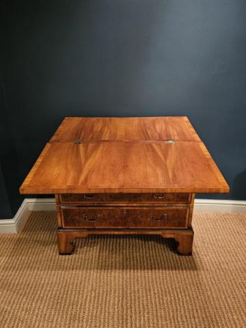 A Fine George III period burr yew chest of drawers with brass swan neck fittings and fold over top forming a writing surface c.1800. The hinged top with burr yew book matched veneers and crossbanded edge, folds over to form a  large writing surface with figured veneer interior. When open the writing surface is supported by pull out sleepers to the front of the chest. Four graduated drawers below, each drawer with book matched figured veneers and crossbanded moulded edges plus original brass swan neck fittings. Moulded plinth to the base with bracket feet below, ash lined drawers with original locks. Presented in excellent condition with a rich colour and polish. Measures 36" wide x 19.75" deep, opening out to 39.5" deep writing surface x 32.5" high. Stock number 42031.