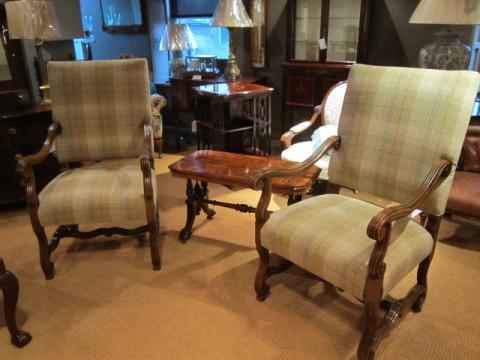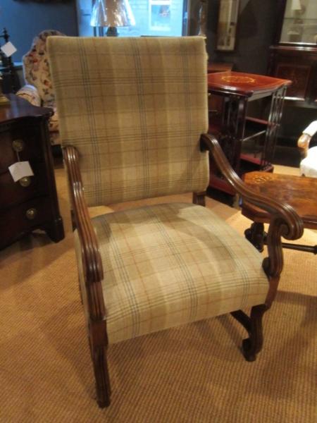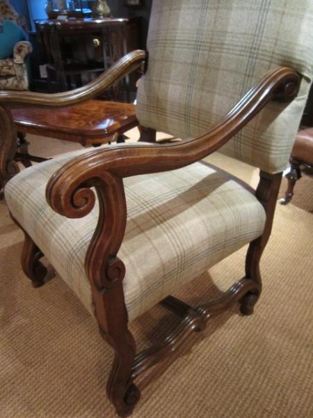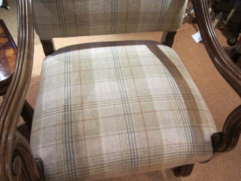 A Fine Pair of Mid Victorian walnut framed armchairs.c.1875. Over stuffed horsehair seats and backs. Scroll arm supports to shaped under carriages and cross stretchers. Recovered to a high standard in Abraham Moon pure wool. Superb condition. Each measures 25"wide x 28"deep x 44"high, 18"seat high.