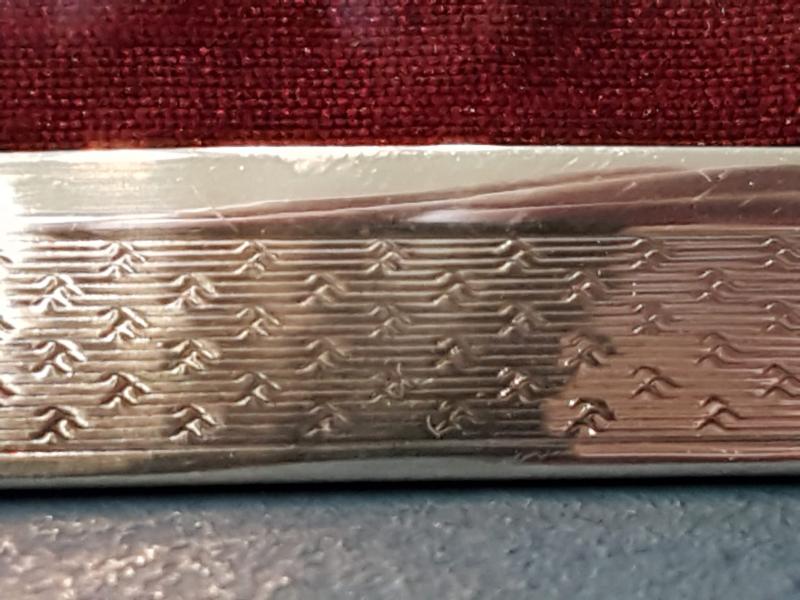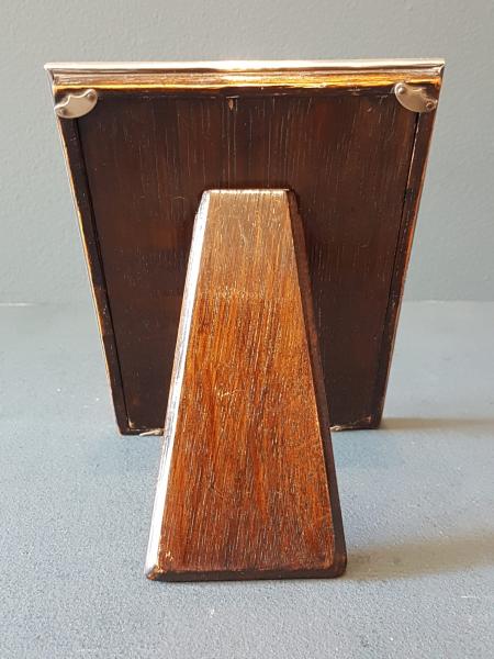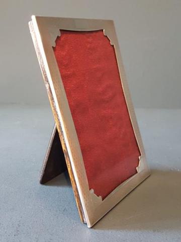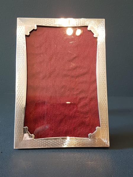 A fine quality George V period solid silver photo frame with decorative engine turned finish, hallmarked Birmingham 1931. The solid silver face with swept inner edge and fine quality engine turned finish. The silver face returning around the sides to meet the solid oak back with sturdy easel, can be displayed in portrait or landscape positions. Bears the makers mark for James Walter Tiptaft. Presented in immaculate condition with a deep shine. Takes photo 5.5" x 3.5". Measures over all 6.5" high x 4.5" wide. Stock number 38176.
