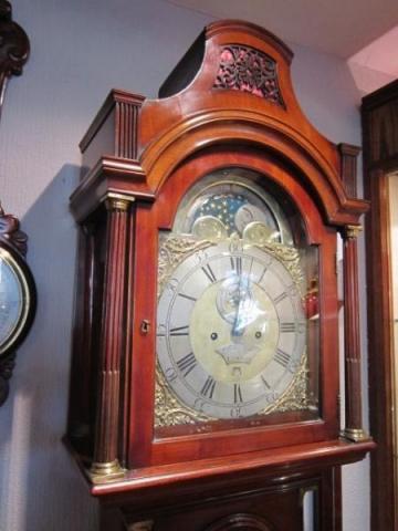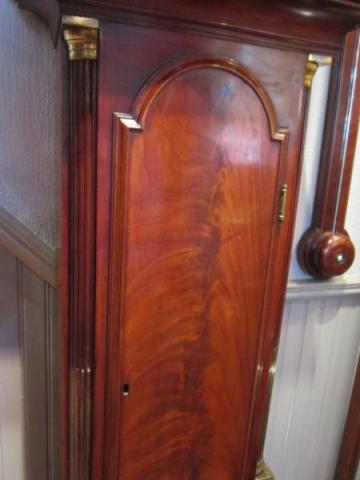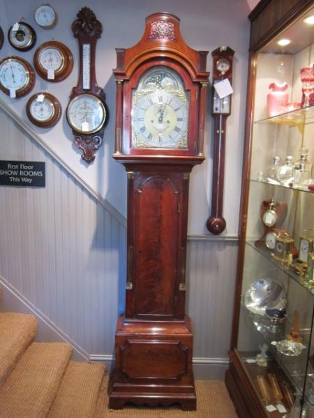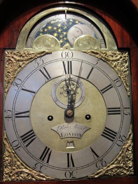A Fine & Small George II flame mahogany 8 Day longcase clock.c.1755. Brass and silvered dial with moon phases to the top arch. Date aperture and seconds count to the matted centre. 5 pillars to the bell striking movement. Small proportioned case with arched top case door flanked by reeded brass inlaid pilasters. Pagoda top hood with side view windows repeated with pillars. Superb colour and patina. Made by Robert Ward of London (working 1751-75). Full working order. Stands 86"high.