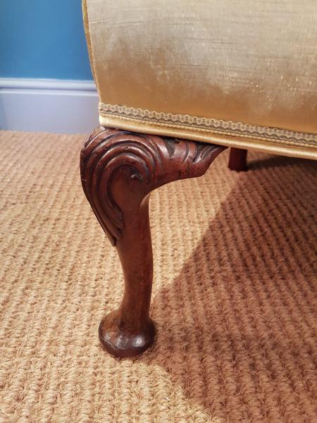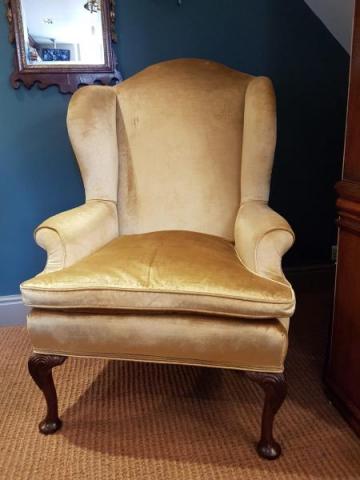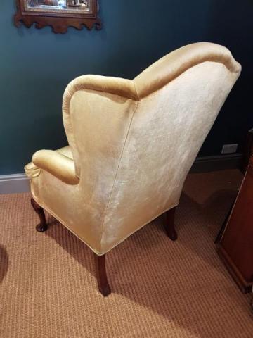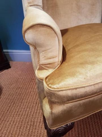 A fine quality Victorian period wing back arm chair sat on well carved walnut cabriole legs. C.1880. The well shaped and detailed frame with original horse hair upholstery recovered to a high standard in top quality bright gold satin velvet. Reversible loose feather seat cushion with piped edges to match the frame. Sat on well carved walnut cabriole legs with original polish. Measures 32" wide x 32" deep x 47" to top of the back. Seat height 21"