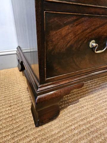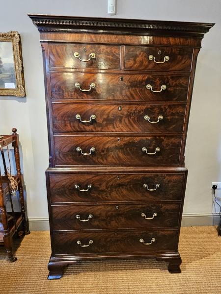 An outstanding quality George III period mahogany secretaire chest on chest in the manner of Gillow, with original brassware and superb original colour and patina c.1760. The upper section with moulded cornice to the top and dental moulding below. Two over three drawer formation; each drawer with figured timbers and cockbead edges. The top chest with quarter reeded canted corners. The base section with moulded edge to the top and three graduated drawers below to match the top chest; the top secretaire drawer pulling out and the front falling with release catches to form a writing surface. The back of the secretaire fitted with a selection of drawers and pigeon holes. Moulded base rail with original ogee bracket feet below and solid mahogany sides. Superbly made with oak drawer linings and choice solid timbers throughout. Presented in excellent original unrestored condition with original brass fittings and locks, superb colour and lovely original patina. Separates in to two sections for moving. Measures 45" wide at the cornice x 23" deep at the cornice x 76" high. Stock number 43220.